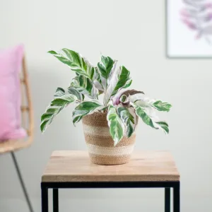 De Ceropegia Woodii Variegata is populaire hangplant en wordt ook wel Chinees Lantaarnplantje of string of hearts genoemd. De hartvormige blaadjes hebben een lichtgrijze kleur met een wit randje. Ze kunnen zelfs meer roze worden wanneer de plant genoeg zon krijgt! De Ceropegia Woodii komt oorspronkelijk uit het oosten van Zuid-Afrika en Zimbabwe. Hier groeit de plant in droge gebieden in bomen of langs rotsen. Deze plant kan bloeien en heeft lampion-vormige bloempjes, vandaar de bijnaam Chinees Lantaarnplantje! Vaak wordt deze plant gehouden als hangplant, maar je kan hem bijvoorbeeld ook laten wikkelen om een plantensteun (https://www.plantje.nl/voor-klimplanten/). Deze bonte zie je minder vaak dan de ‘normale’ versie en is daarom extra speciaal! Let op! – Hoewel veel planten met variegatie lastig te verzorgen zijn, is de Ceropegia Woodii Variegata niet zo moeilijk! Daarom is dit ook een leuke bijzondere plant voor beginners. Lichtbehoefte – Op een plekje in de volle zon groeit deze