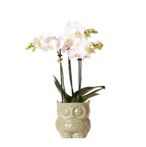 Kolibri Orchids | witte Phalaenopsis orchidee – Amabilis + Owl sierpot groen – potmaat Ø9cm – 40cm hoog | bloeiende kamerplant in bloempot – vers van de kweker