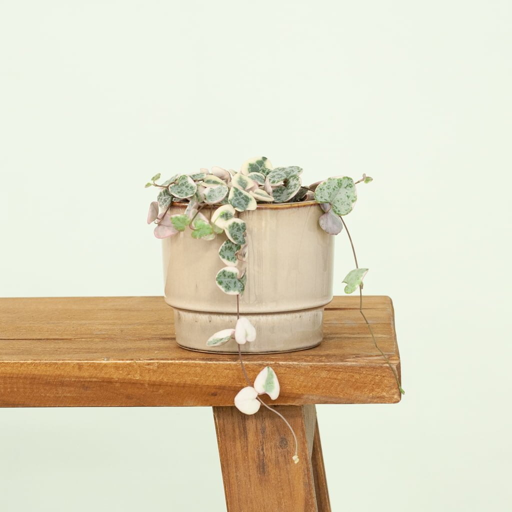 De Ceropegia Woodii Variegata is populaire hangplant en wordt ook wel Chinees Lantaarnplantje of string of hearts genoemd. De hartvormige blaadjes hebben een lichtgrijze kleur met een wit randje. Ze kunnen zelfs meer roze worden wanneer de plant genoeg zon krijgt! De Ceropegia Woodii komt oorspronkelijk uit het oosten van Zuid-Afrika en Zimbabwe. Hier groeit de plant in droge gebieden in bomen of langs rotsen. Deze plant kan bloeien en heeft lampion-vormige bloempjes, vandaar de bijnaam Chinees Lantaarnplantje! Vaak wordt deze plant gehouden als hangplant, maar je kan hem bijvoorbeeld ook laten wikkelen om een plantensteun (https://www.plantje.nl/voor-klimplanten/). Deze bonte zie je minder vaak dan de ‘normale’ versie en is daarom extra speciaal! Let op! – Hoewel veel planten met variegatie lastig te verzorgen zijn, is de Ceropegia Woodii Variegata niet zo moeilijk! Daarom is dit ook een leuke bijzondere plant voor beginners. Lichtbehoefte – Op een plekje in de volle zon groeit deze